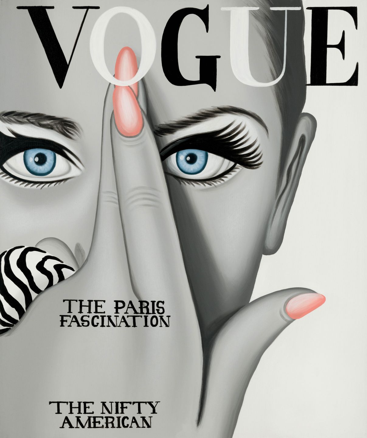 This is a beautiful print of our handpainted Vogue painting. It is the front cover of a Vogue magazine featuring piercing blue eyes peeking out behind crossed fingers
