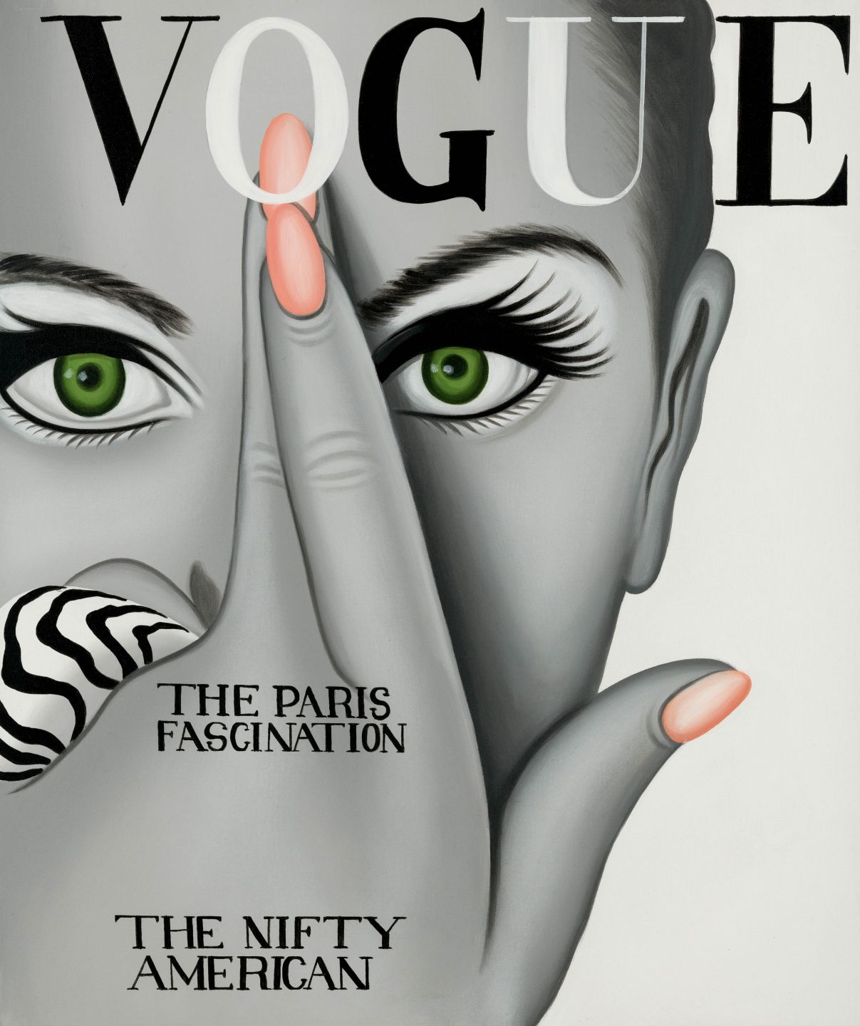 This is a beautiful print of our handpainted Vogue painting. It is the front cover of a Vogue magazine featuring piercing green eyes peeking out behind crossed fingers