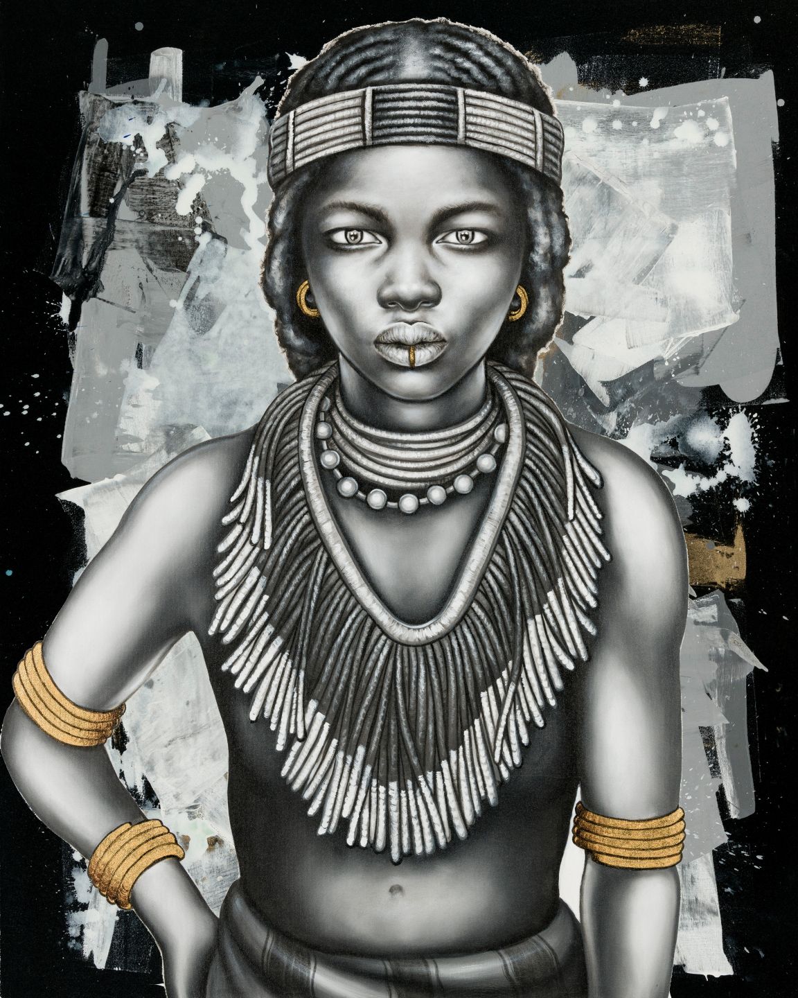 Beautiful print of our handpainted black and white tribal girl with lip ring and gold tone jewellery on a abstract background.
