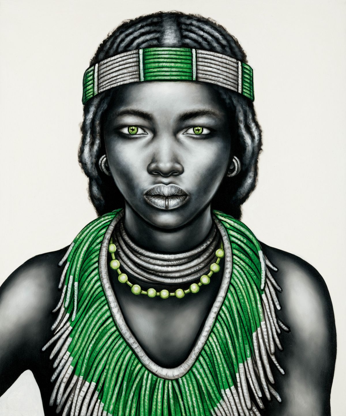 Beautiful print of our handpainted black and white tribal girl with lip ring and green jewellery.
