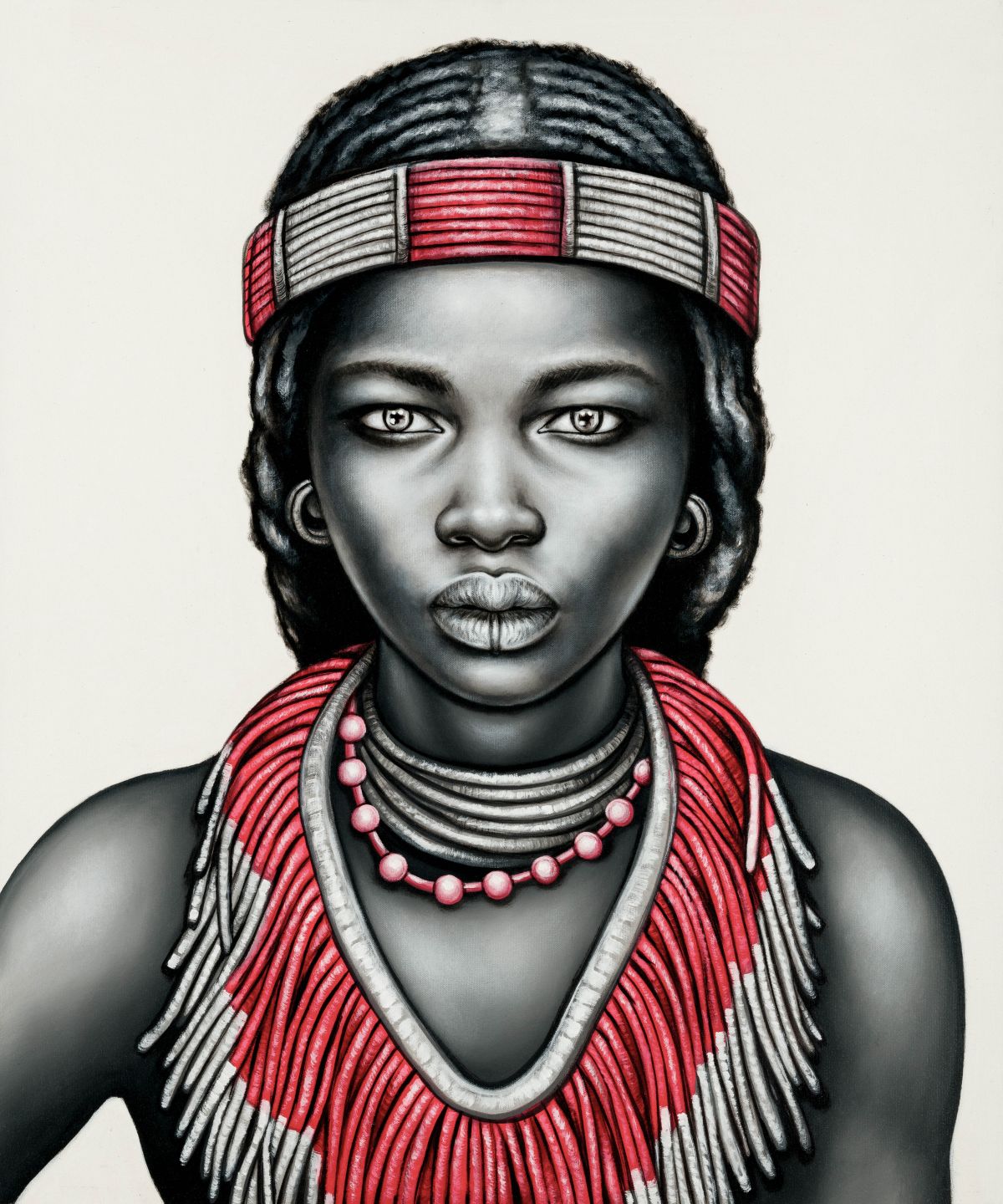 Beautiful print of our handpainted black and white tribal girl with lip ring and red jewellery.