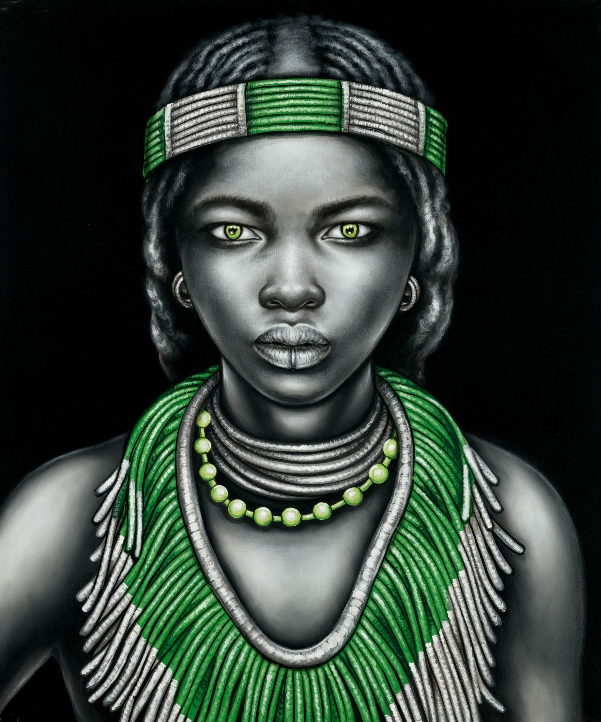 Beautiful print of our handpainted black and white tribal girl with lip ring and green jewellery on a charcoal background.
