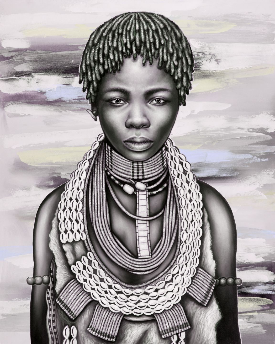 Beautiful black and white print of a tribal woman with one earring and dreadlocks on a white background.