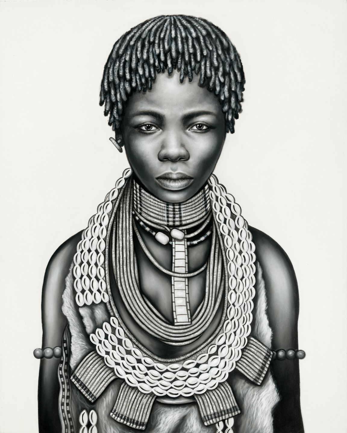 Beautiful black and white print of a tribal woman with one earring and dreadlocks on a white background.