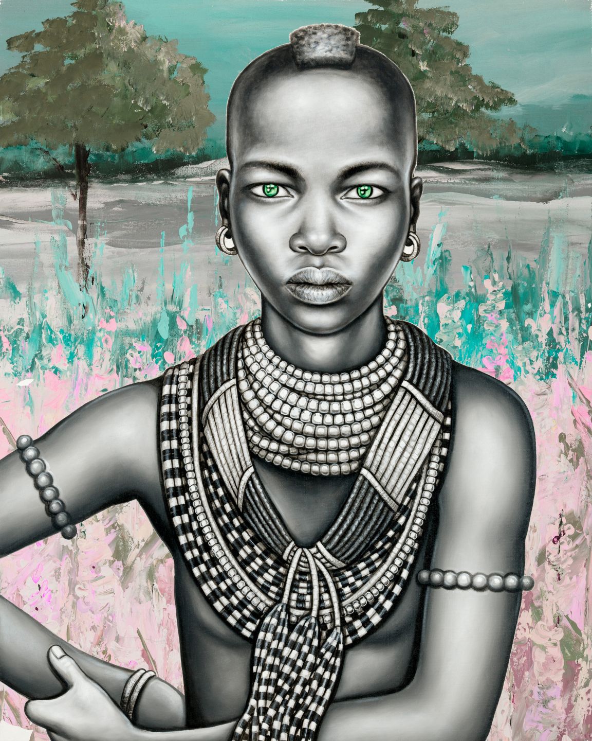 Beautiful print of our handpainted black and white tribal girl with mohawk on a abstract background.