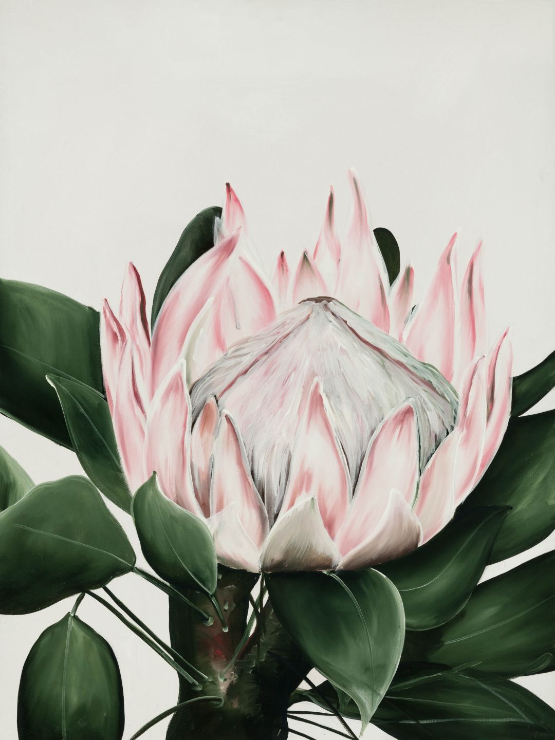 Beautiful print of a hand painted king protea in beautiful shades of pastel pink and green.
