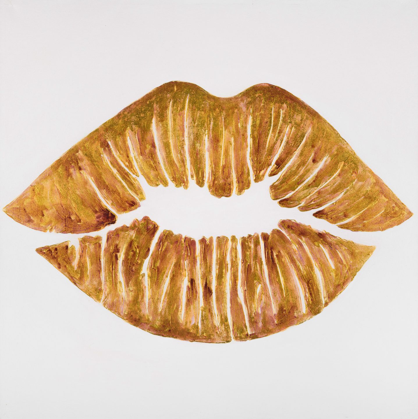Beautiful print of gold foil lips on a stark white background.