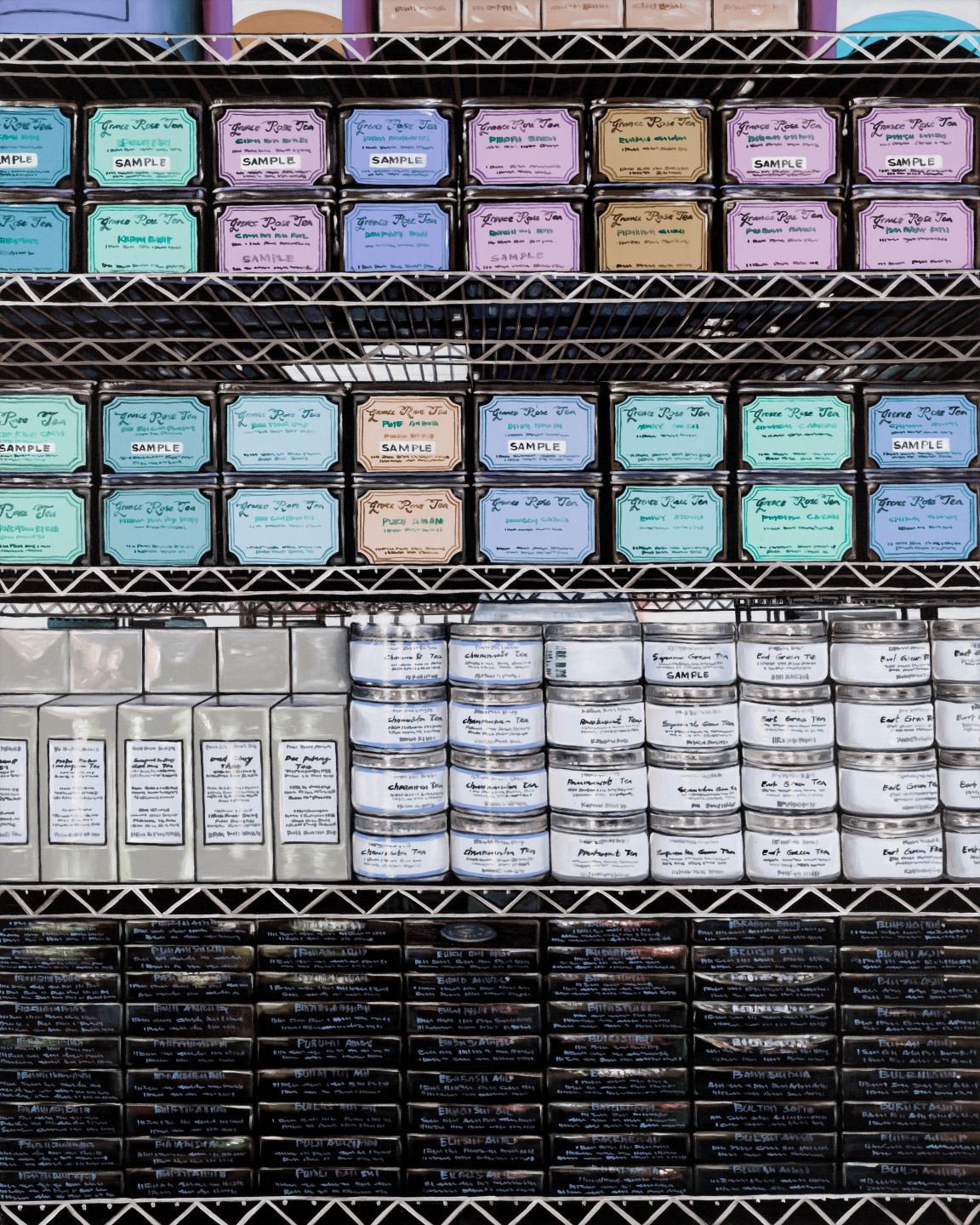 Beautiful print of our handpainted rows of tea boxes in an array of pastel tones.