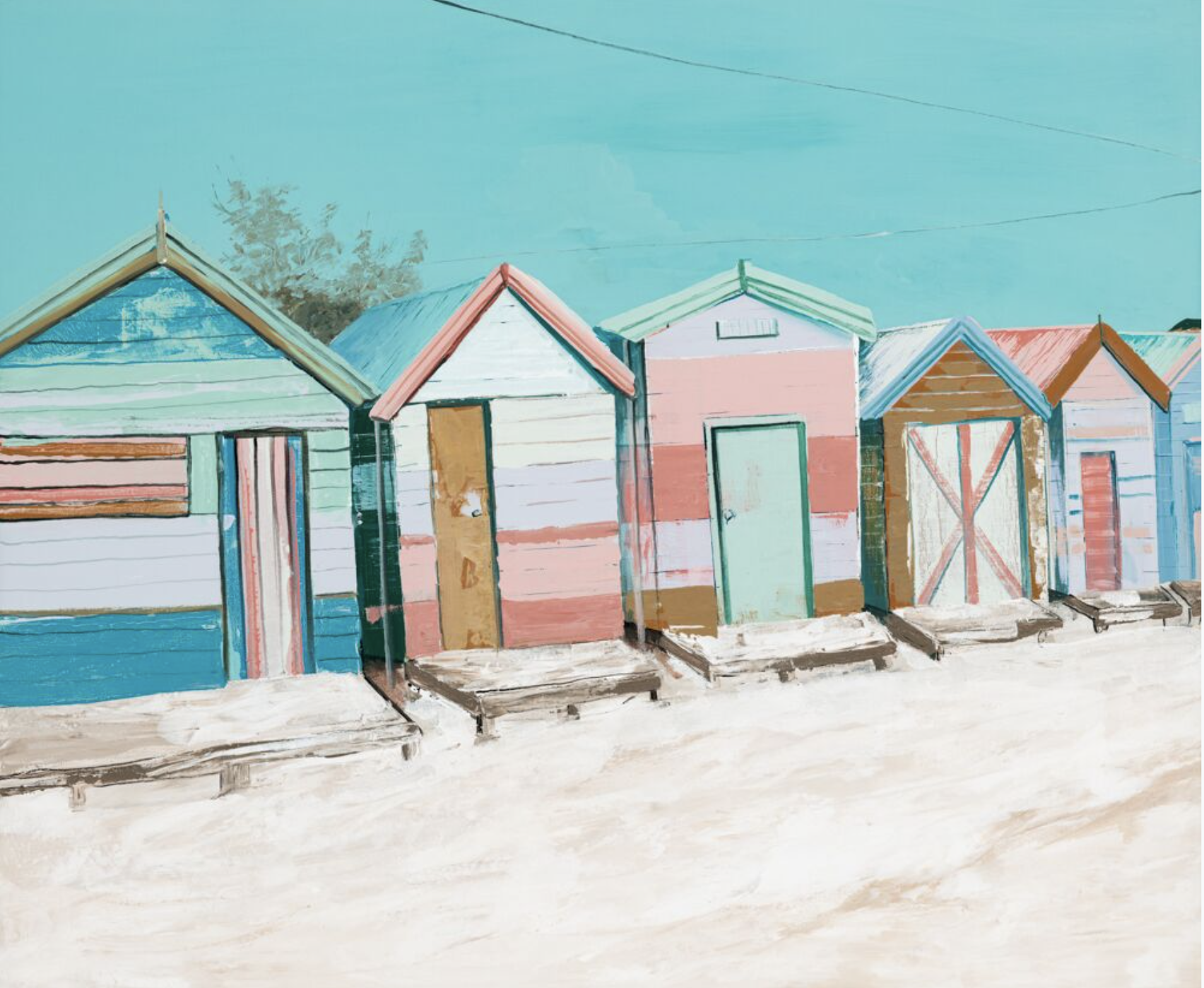 Beautiful multicolour abstract print of beach boxes featuring peach, aqua, jade, blue and lilac.