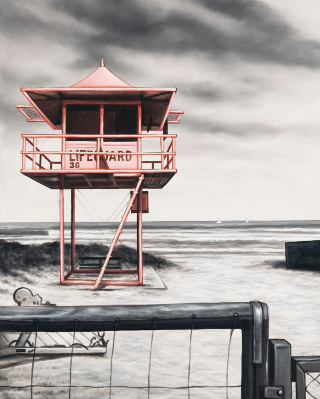 Beautiful print of a coloured lifeguard box on a black and white background.