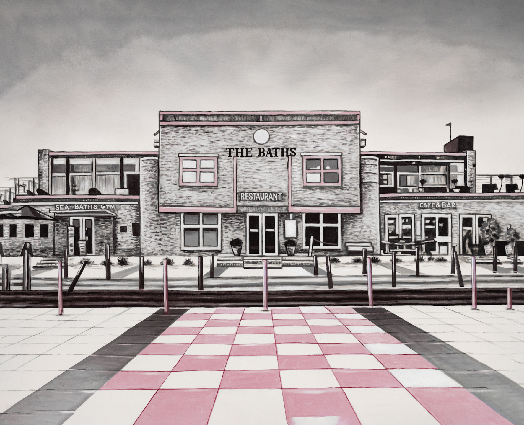 Beautiful multicolour print of 'The Baths' featuring soft pink highlights on a black and white background.