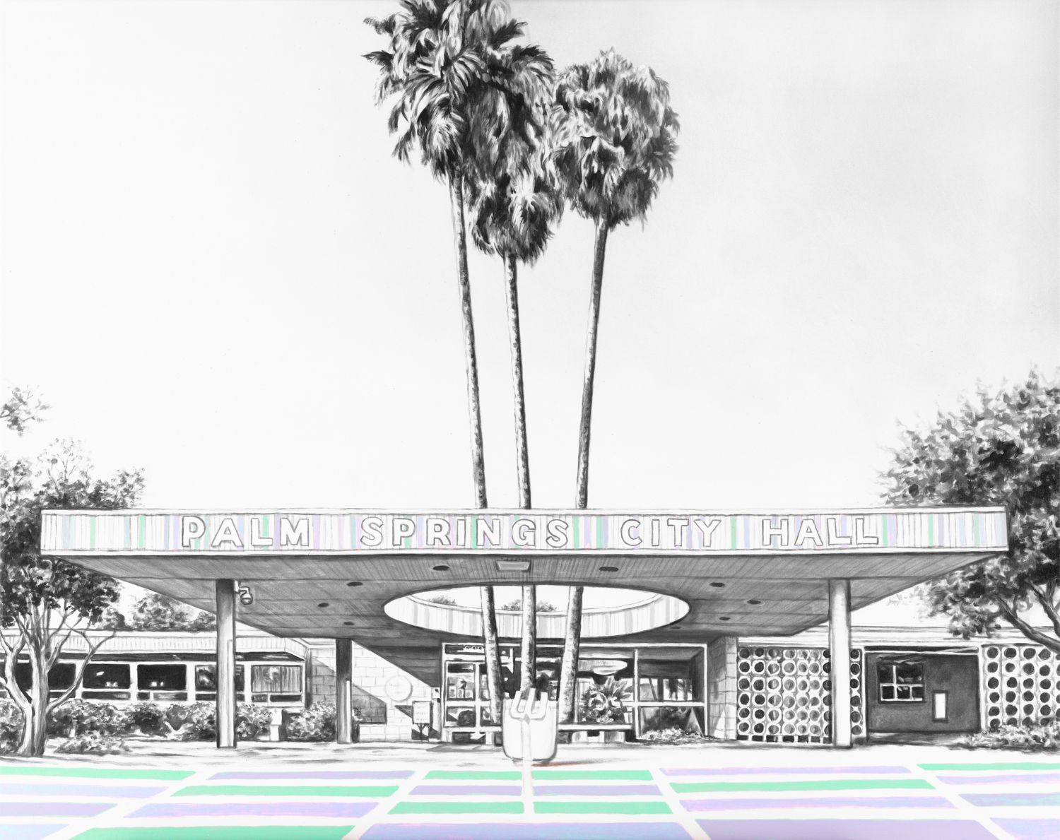 Palm Springs City Hall multicolour abstract print featuring green, blue, magenta and black and white.
